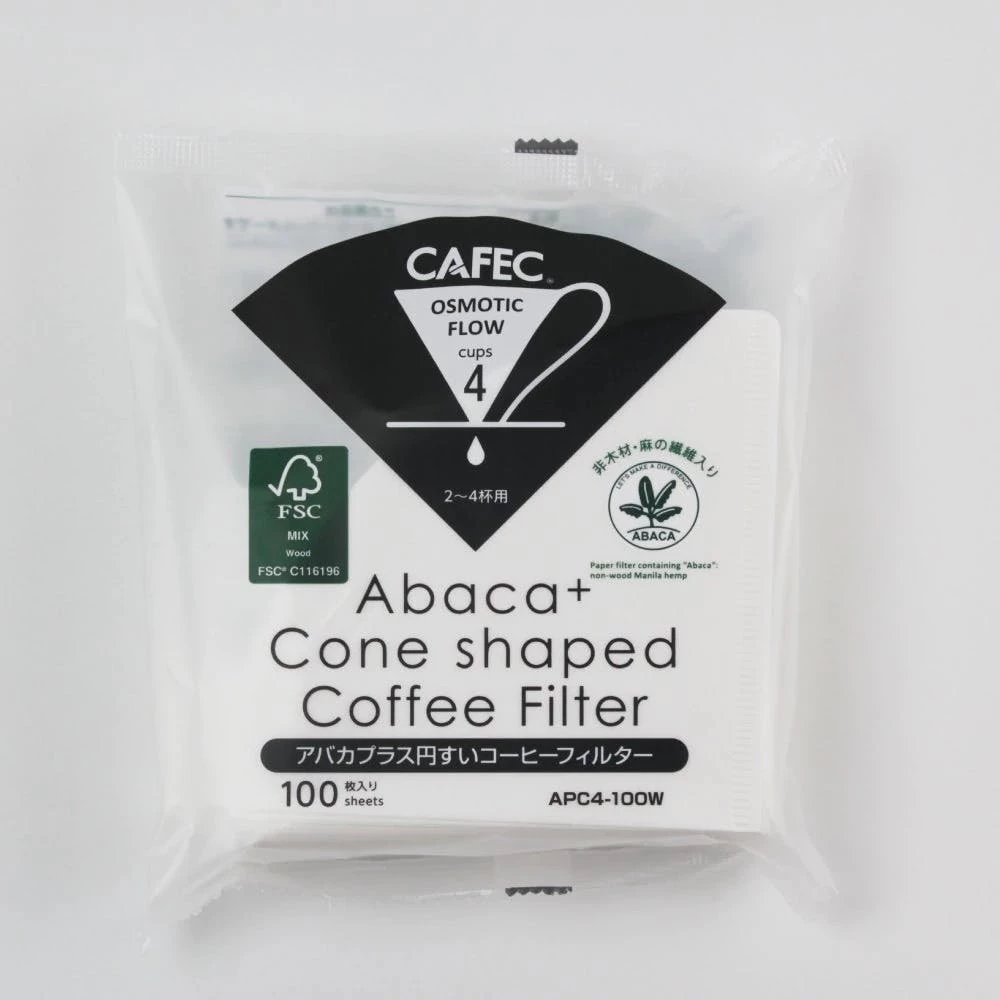 Packung mit 100 Papierfiltern von der Marke CAFEC. Die Filter sind mit dem Typ Cup 1 (1 Tasse) kompatibel. Sie sind hergestellt aus sauerstoffgebleichtem Papierzellstoff und Abaca (Manilahanf). Diese Materialzusammensetzung verleiht den Filtern eine gute Luft- und Flüssigkeitsdurchlässigkeit sowie eine gute Zähigkeit und Elastizität.