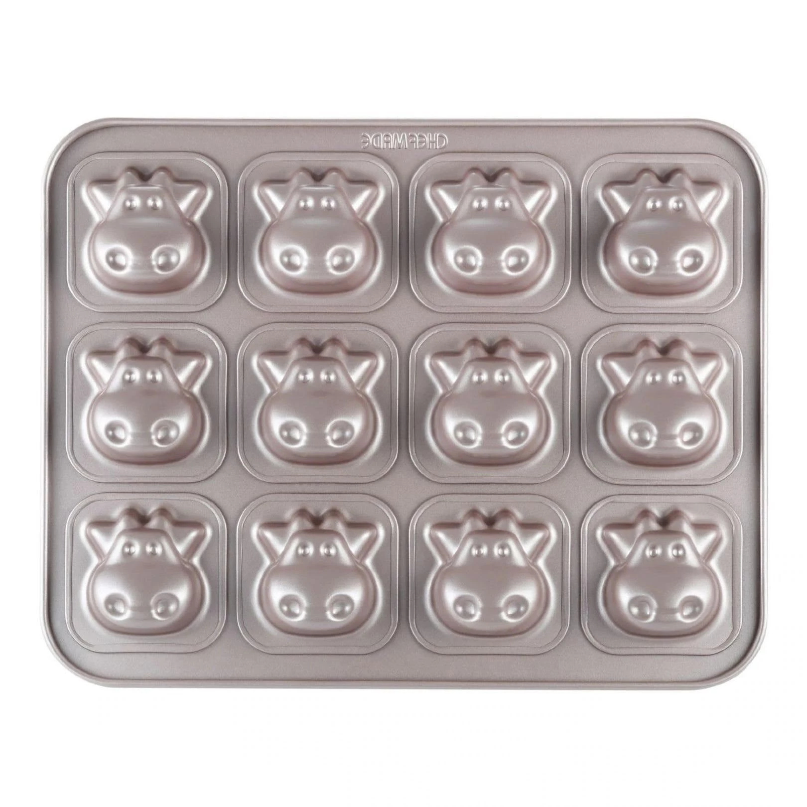 Edle Muffinform mit Kuhmotiv Diese einzigartige CHEFMADE Backform im Kuhmotiv lädt zum kreativen Experimentieren mit Backideen und Verzierungen ein. Das Kuhdesign auf dem Backblech, lässt aus einem einfachen Rührteig kreative Backideen entstehen. Eine fantastische Wahl zum gemeinsamen Backen mit den Kleinsten oder für das leckere Abend-Buffet auf dem Kindergeburtstag. Spezifikationen im Überblick: Muffinbackform mit 12 kleinen Vertiefungen. Gefertigt aus hochwertigem Karbonstahl (bis 230 Grad Celsius hitzebeständig) mit 0,8 mm Stärke für eine optimale Wärmeverteilung Lebensmittelechte Antihaftbeschichtung aus Silikon (PTFE-frei), die ein Festkleben der Backwaren auf dem Blech verhindert Einfache Reinigung mit lauwarmem Wasser, anschließend im Ofen trocknen lassen