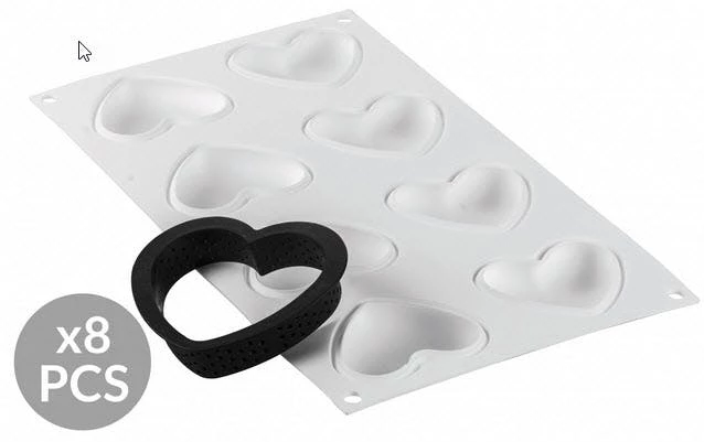 Die traditionelle Torte kommt dank dem Set Tarte Ring Amore in einem neuen “Kleid”. Das Set besteht aus zwei Elementen: acht 80 x 70 h 20 mm Ringe aus thermoplastischem, bruchsicherem Verbundmaterial, das zum Backen und Herstellen der Basis geeignet ist und einer Silikonform, die aus 8 Hohlräumen von jeweils 65 x 55 h 15 mm besteht, um eine Mousse herzustellen oder eine Creme zum Auflegen auf das Mürbeteiggebäck. Die Ringe sind antihaftend und rostfrei, ermöglichen ein homogenes Backen und zeichnen sich durch eine hohe thermische Stabilität aus.